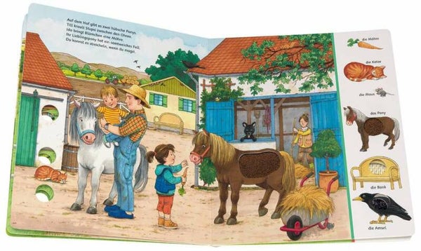 Haide, să descoperim ferma! Ei bine, unde se ascundea micuta oita? Și cât de pufoasa este blana ei? Simte! Multe elemente captivante vă invită să atingeți și să descoperiți. Și dacă te uiți foarte atent, poți găsi multe imagini mici de la marginea paginii în scenele mari. Această carte antrenează simțul tactil, promovează capacitatea de concentrare și, mai presus de toate, este foarte distractiva.Textele scurte de lectură și numele obiectelor și animalelor de pe imaginile de căutare încurajează vorbirea și povestirea și astfel susțin dezvoltarea limbajului.