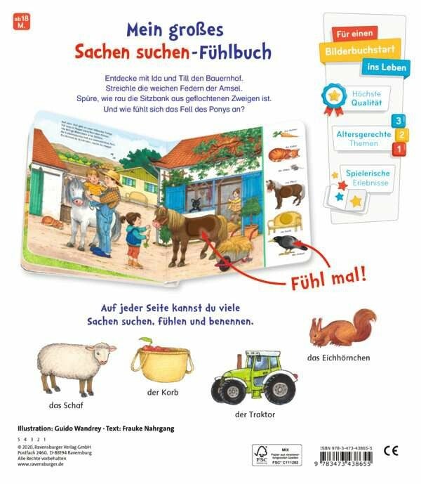 Komm, wir entdecken den Bauernhof!Nanu, wo hat sich das kleine Schäfchen versteckt? Und wie kuschelweich ist sein Fell? Fühl doch mal!Viele spannende Fühl-Elemente laden zum Tasten und Entdecken ein. Und wenn du ganz genau hinschaust, kannst du viele kleine Bilder vom Seitenrand in den großen Szenen wiederfinden. So schult dieses Buch den Tastsinn, fördert die Konzentrationsfähigkeit und macht vor allem jede Menge Spaß.Die kurzen Vorlesetexte und die Benennung der Gegenstände und Tiere auf den Suchbildern regen zum Sprechen und Erzählen an und unterstützen damit die Sprachentwicklung.